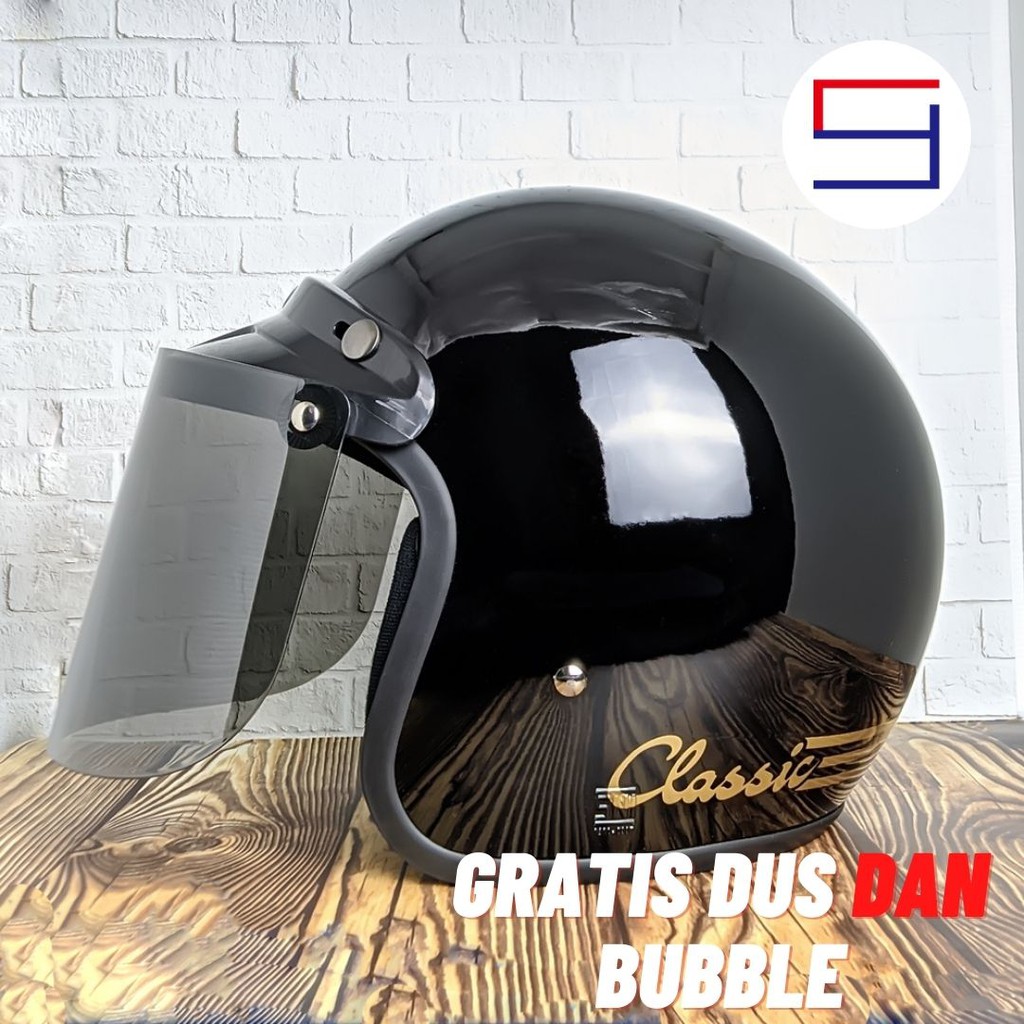 Helm Bogo polos tiga garis classic kaca datar flat injak free packing bubble