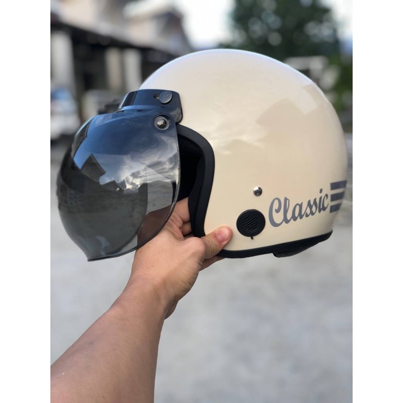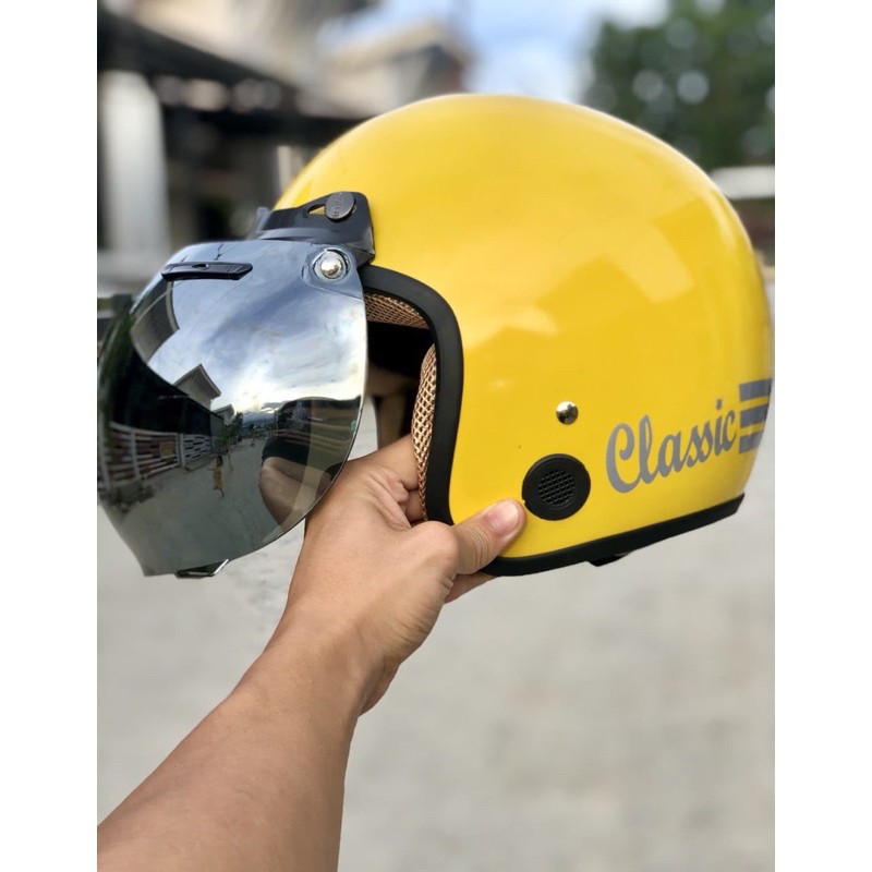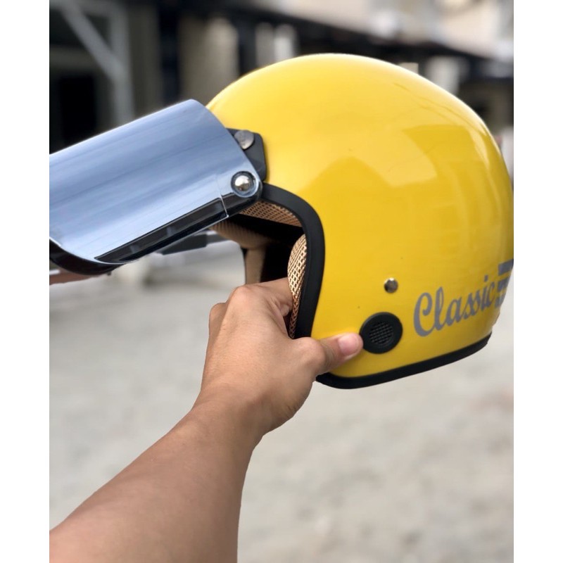 HELM JPN BOGO RETRO ARC KUNING GLOSSY KACA DATAR FLAT VISOR