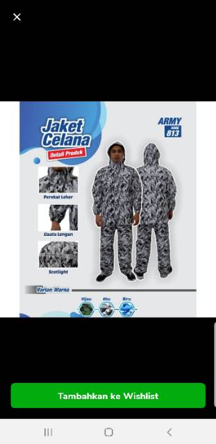 Rifan Juga punya 4 Produk lain terkait Produk Jas Hujan Jaket Celana ARMY - TENTARA LORENG Plevia Kode 813 yang perlu Anda lirik karena menarik, Produk itu adalah....