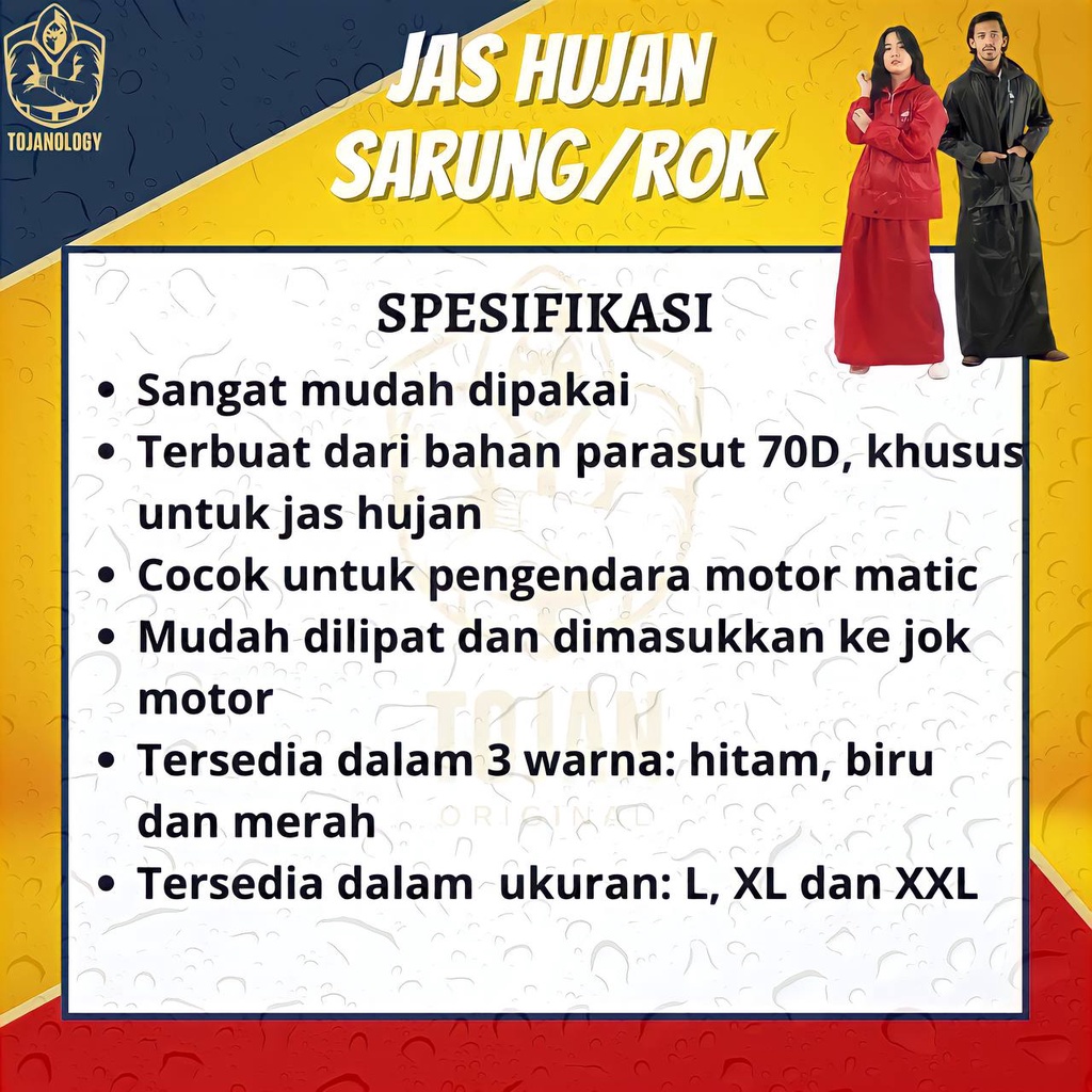 Rifan Juga punya 4 Produk lain terkait Produk Jas Hujan Pria Wanita Mantel Hujan Jas Ujan Dewasa Raincoat Pria Wanita Tebal Keren Setelan Rok Gamis Muslimah ROK TOJAN BESTSELLER yang perlu Anda lirik karena menarik, Produk itu adalah....