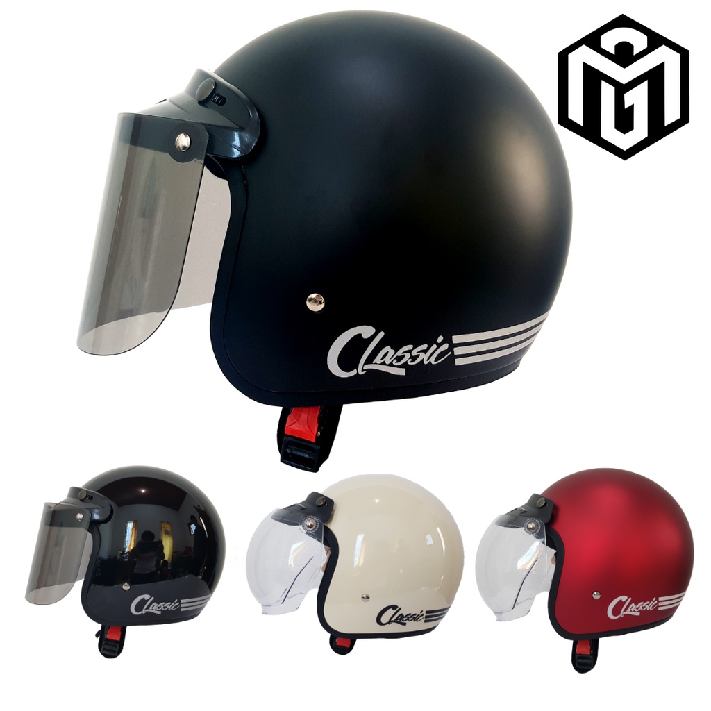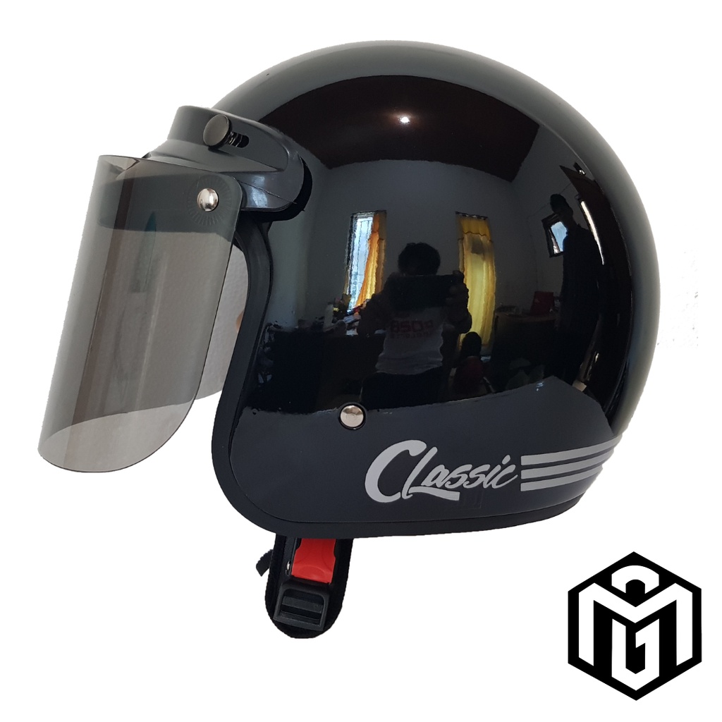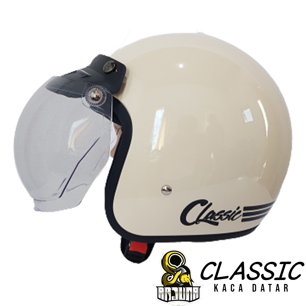 Helm Bogo Retro Classic Klasik Garis Tiga Dewasa Pria Wanita SNI Sepaket Kaca Datar/cembung