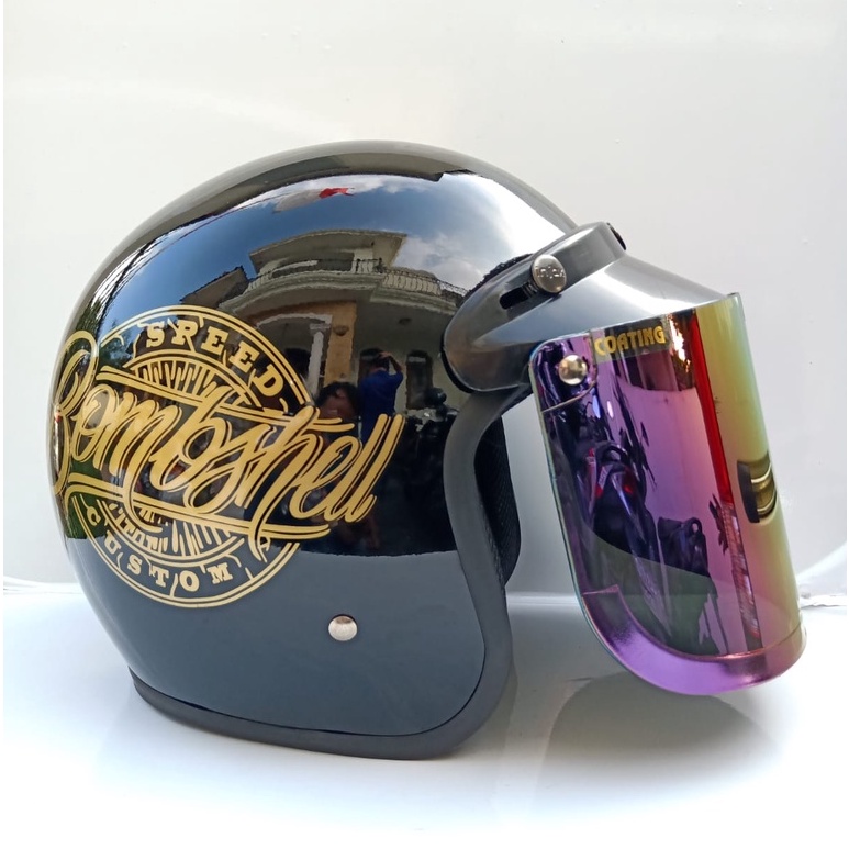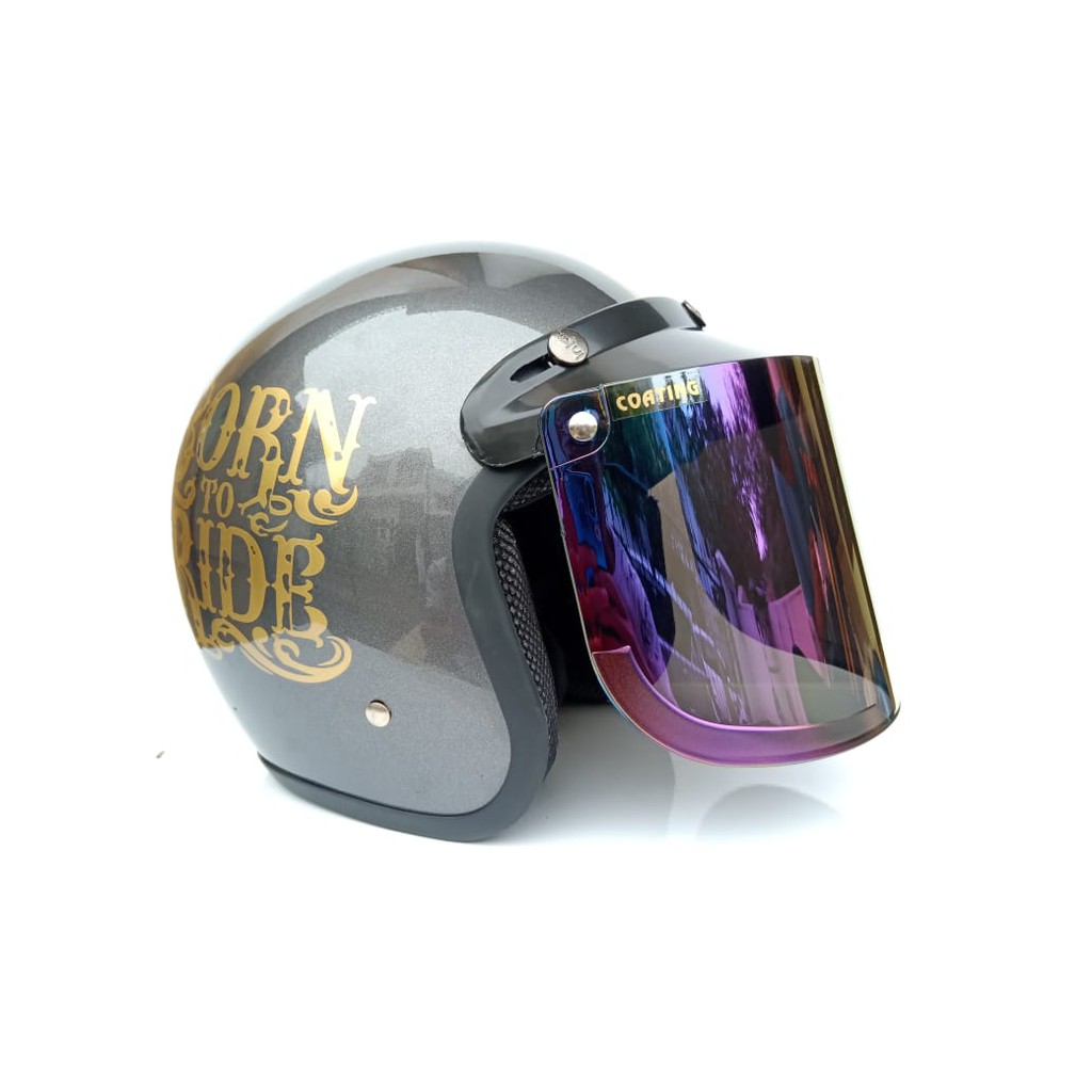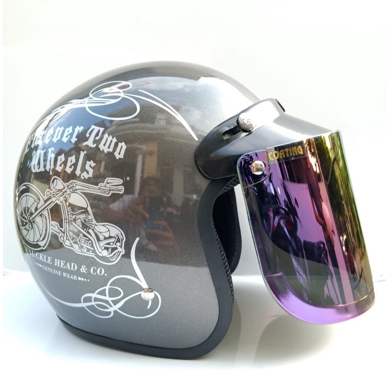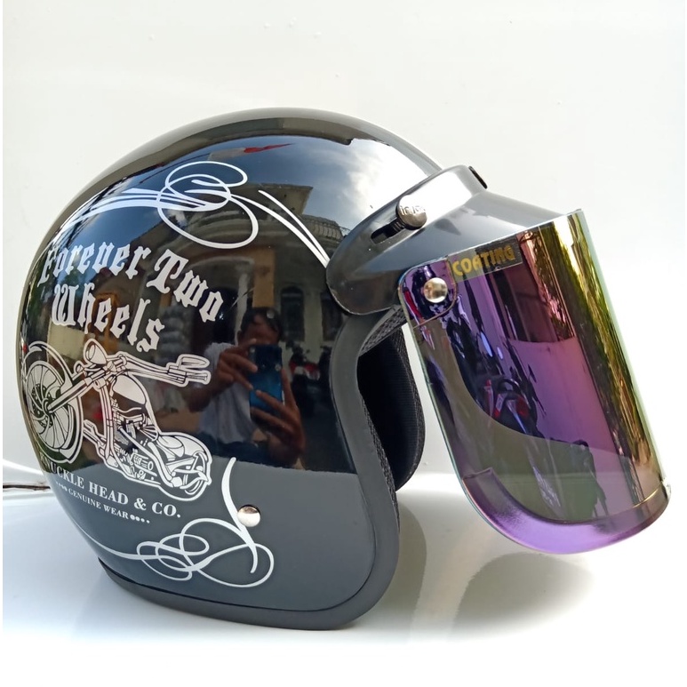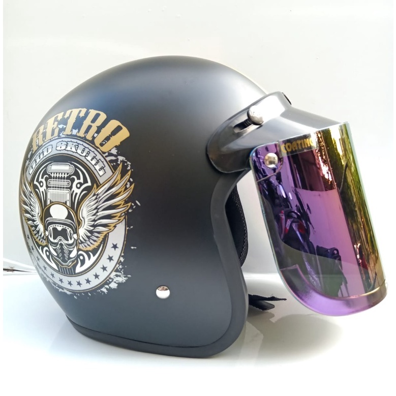 HELM BOGO RETRO DEWASA SNI PRIA WANITA KACA CEMBUNG DATAR FLAT SILVER PELANGI SMOK HITAM GOOGLE