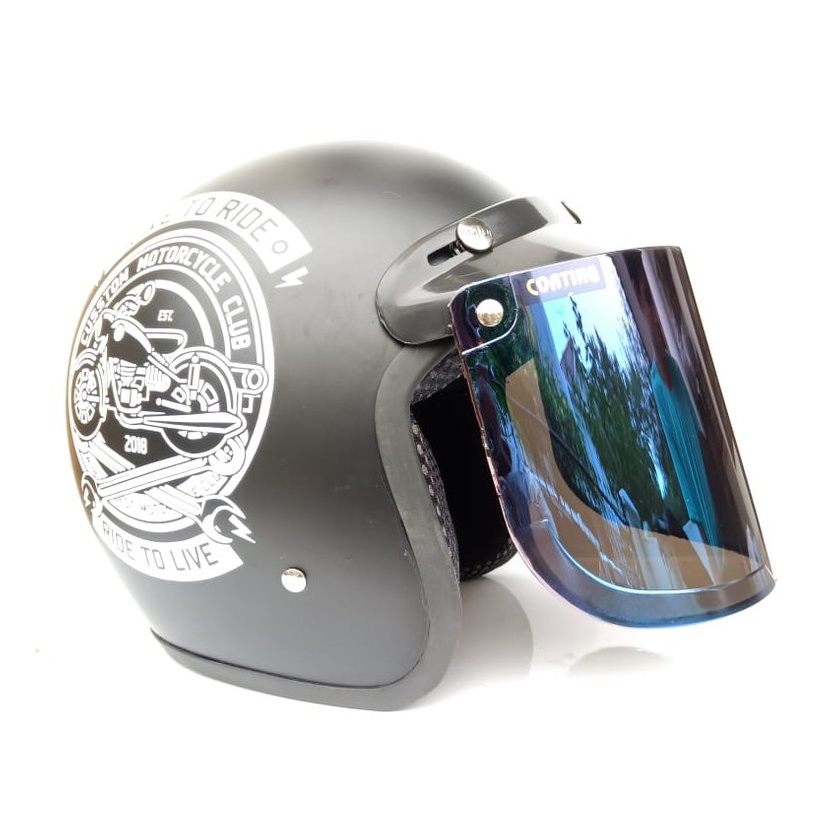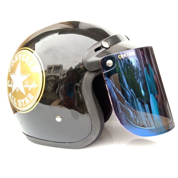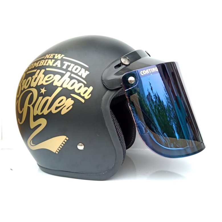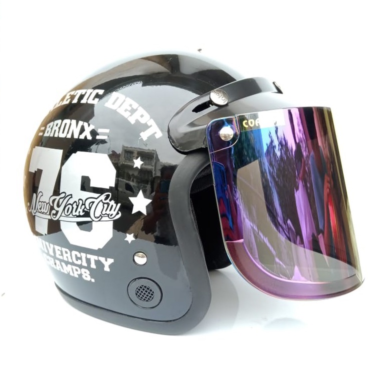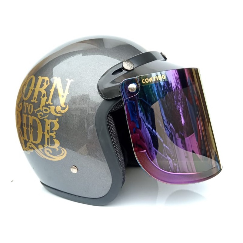HELM BOGO RETRO DEWASA SNI PRIA WANITA KACA CEMBUNG DATAR FLAT SILVER PELANGI SMOK HITAM GOOGLE