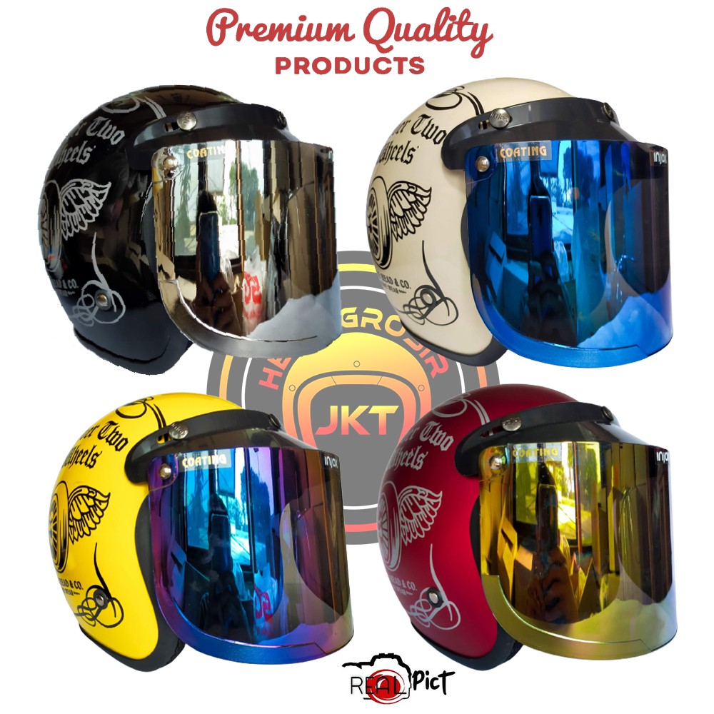 Alasan kenapa harus beli HELM BOGO RETRO MOTIF TWO WHEELS DEWASA KACA DATAR INJAK GOLD/BLUE/SILVER/RAINBOW PRIA WANITA COD sekarang