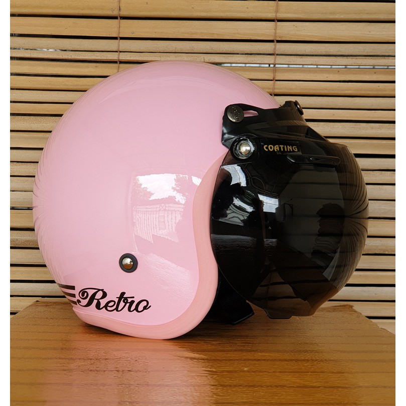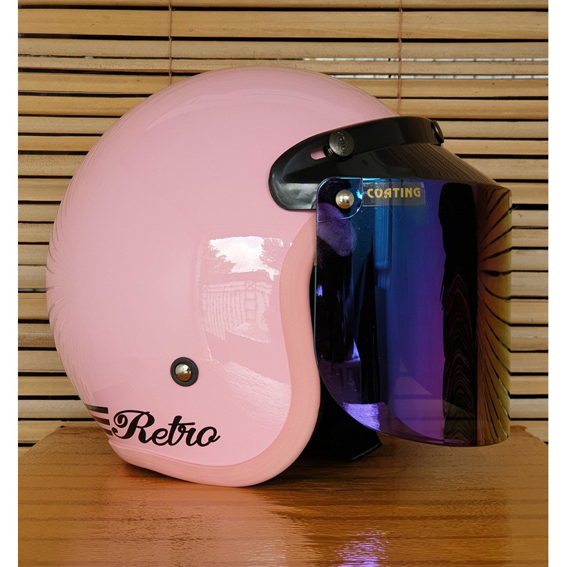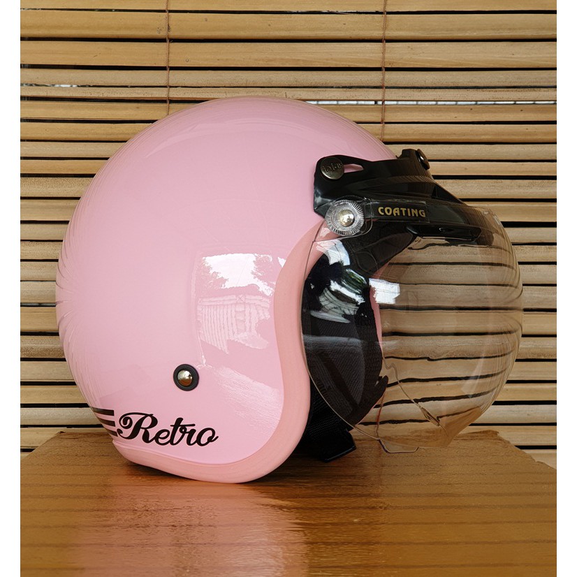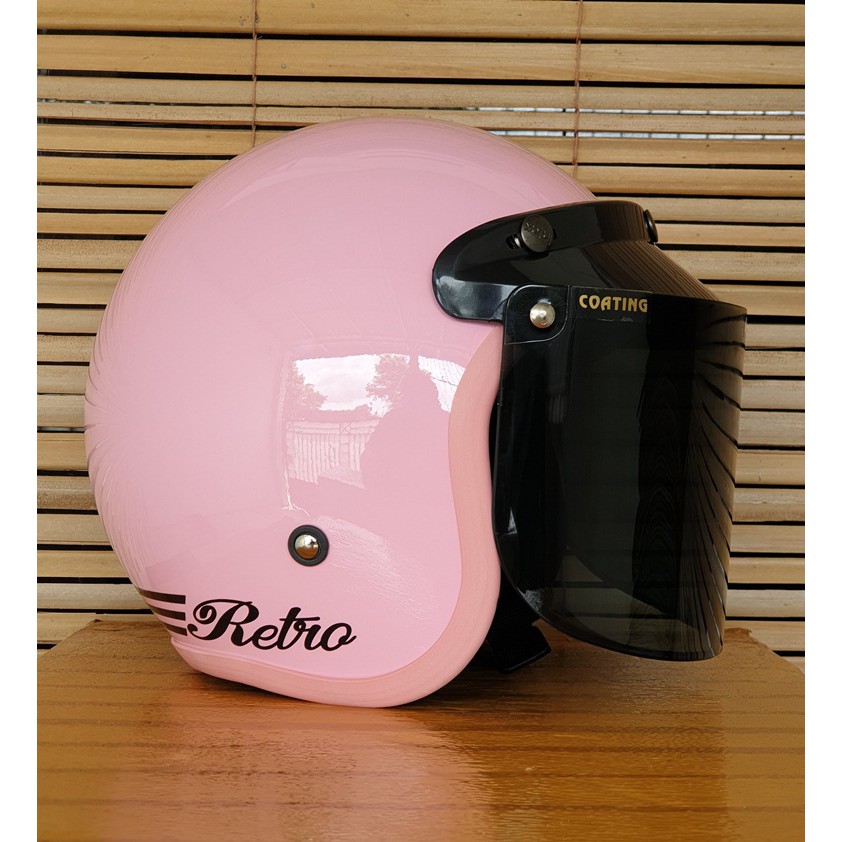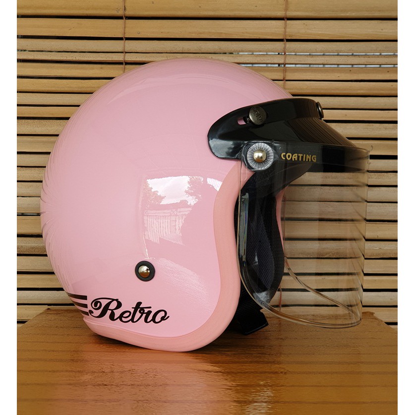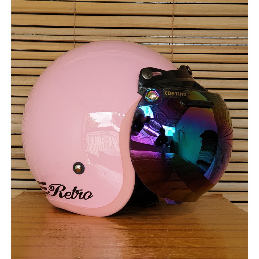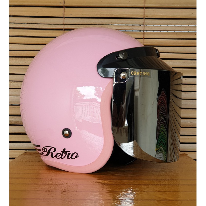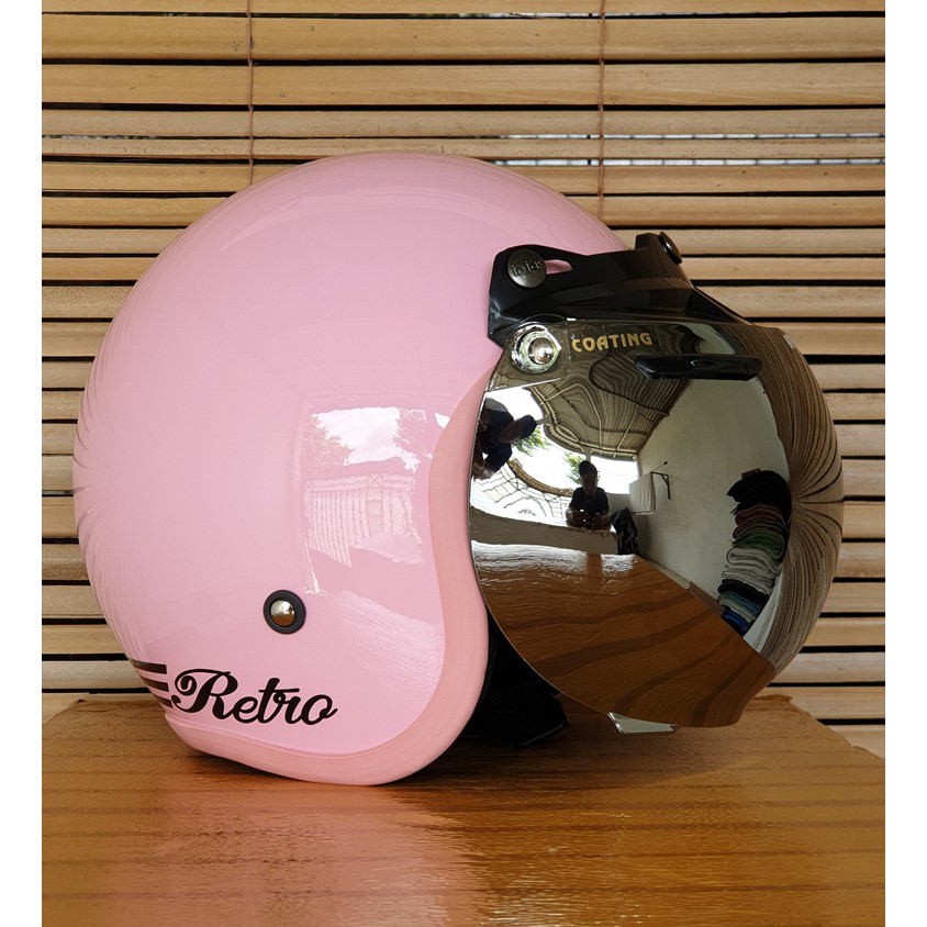 helm bogo wanita dewasa cewek warna pink pastel stabilo kaca datar dan cembung motif retro