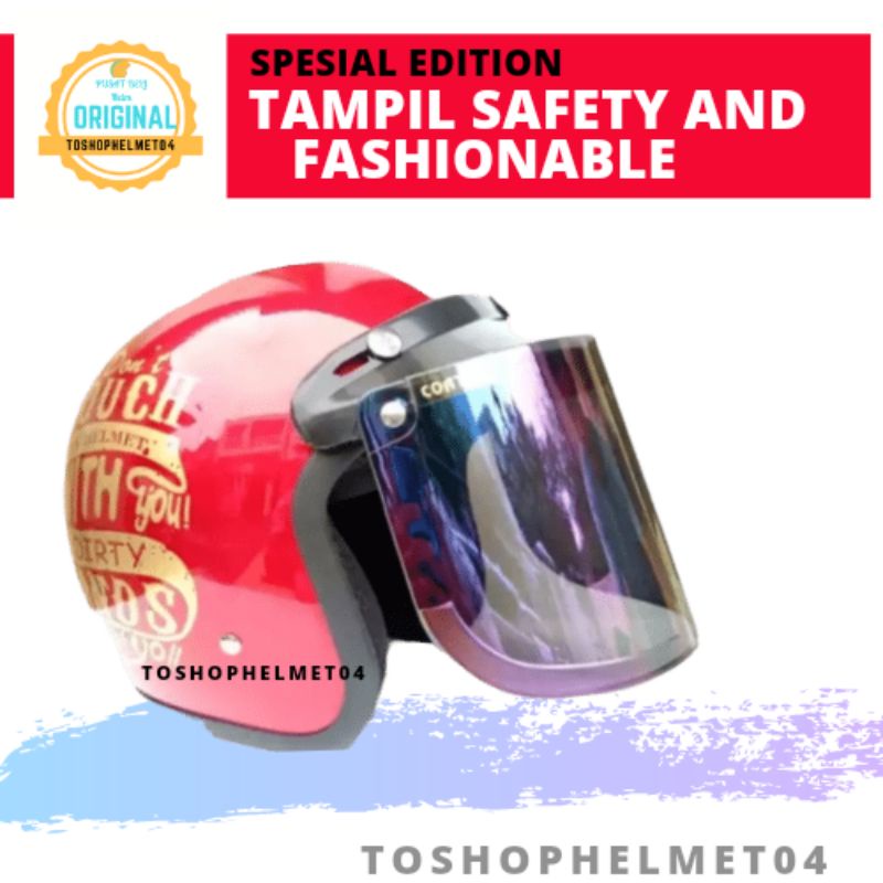 helm bogo dewasa warna merah dof untuk wanita pria cewek cowok motif tulisan retro