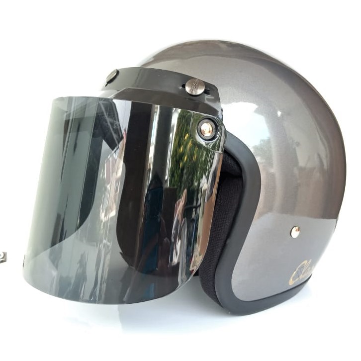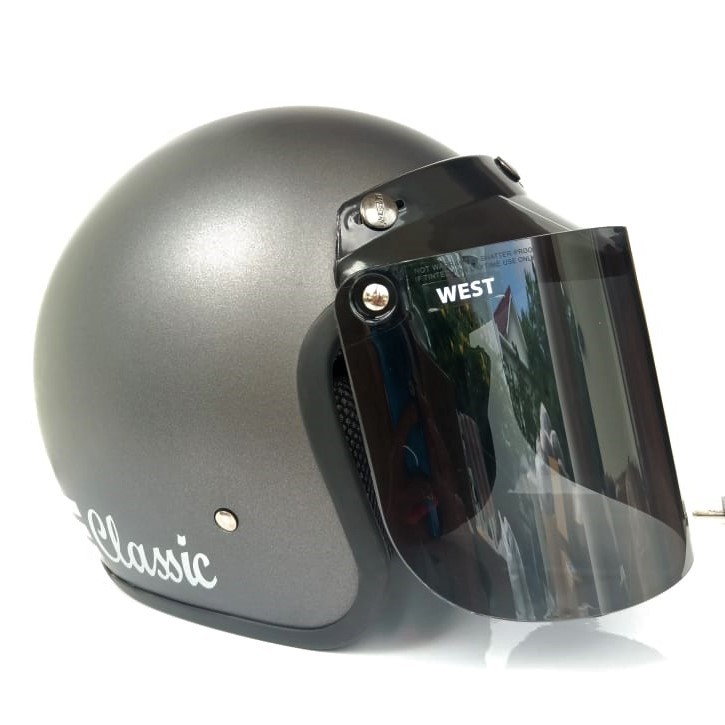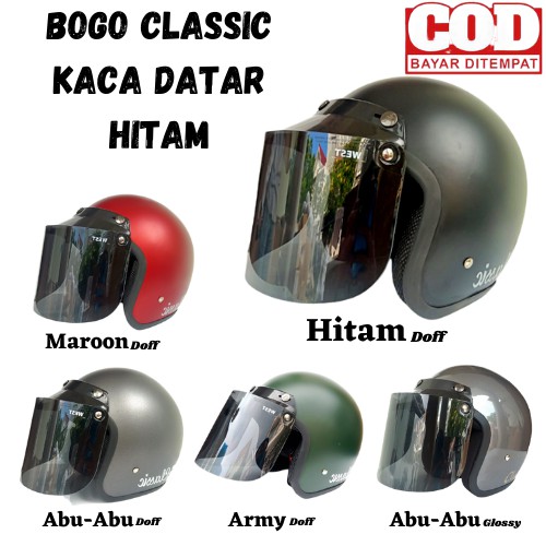 HELM BOGO RETRO HITAM GLOSSY TULISAN CLASSIC HITAM KACA FLAT HITAM SMOKE DEWASA