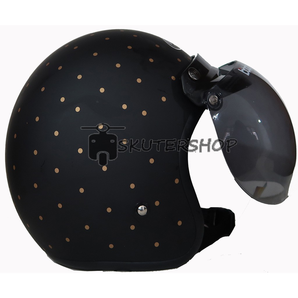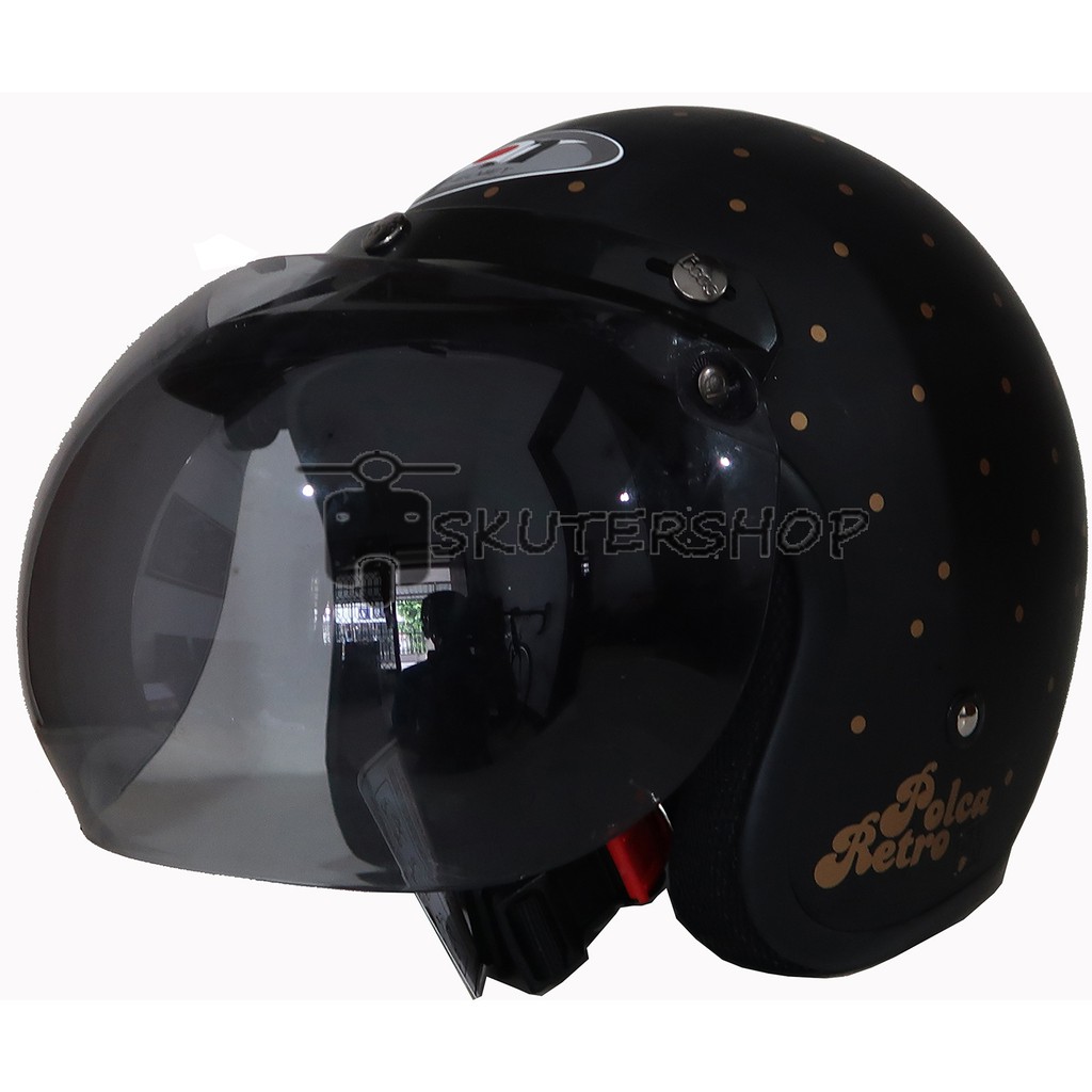 Skutershop JPN Helm Bogo Retro SNI Klasik Polkadot Polca Retro Lucu Hitam Doff Gold Kaca Bogo Ori