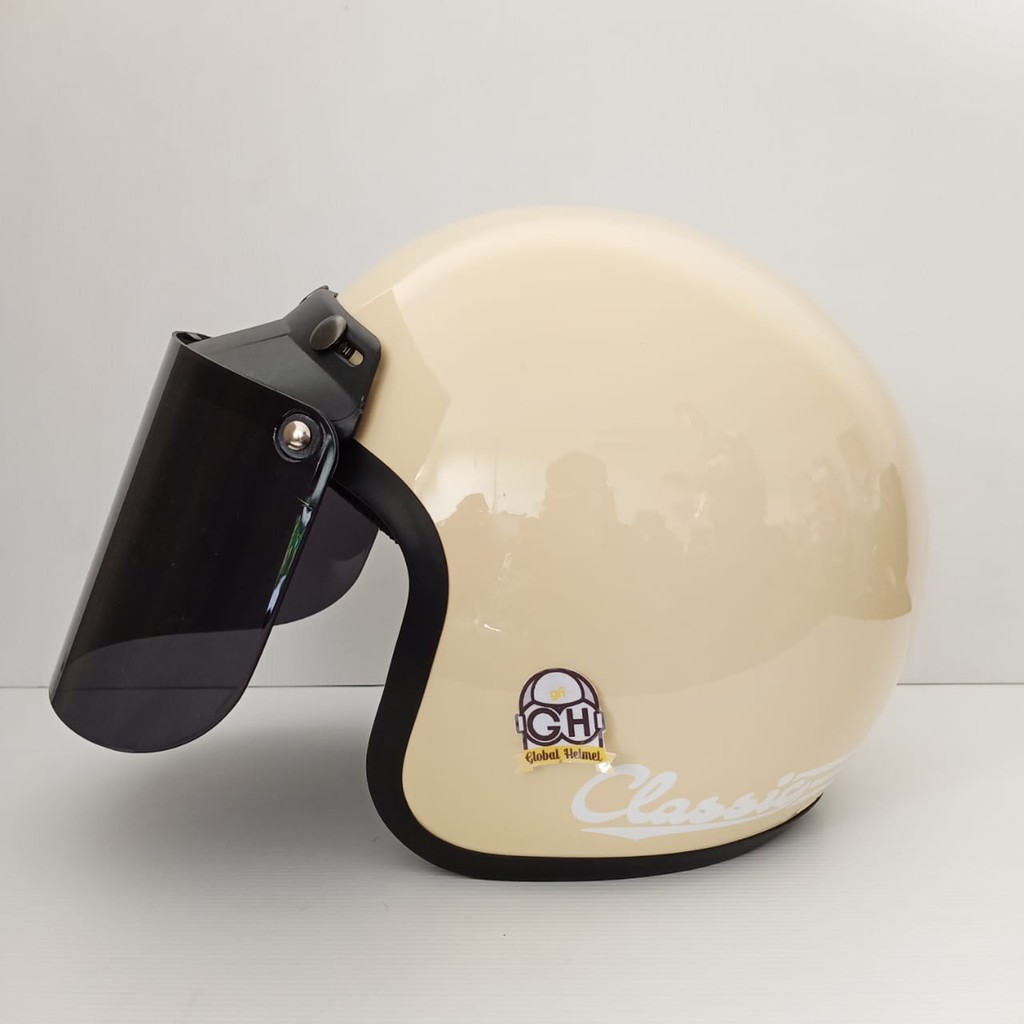 Helm Bogo Classic Garis Cream Lis Hitam Kaca Datar Retro SNI Dewasa